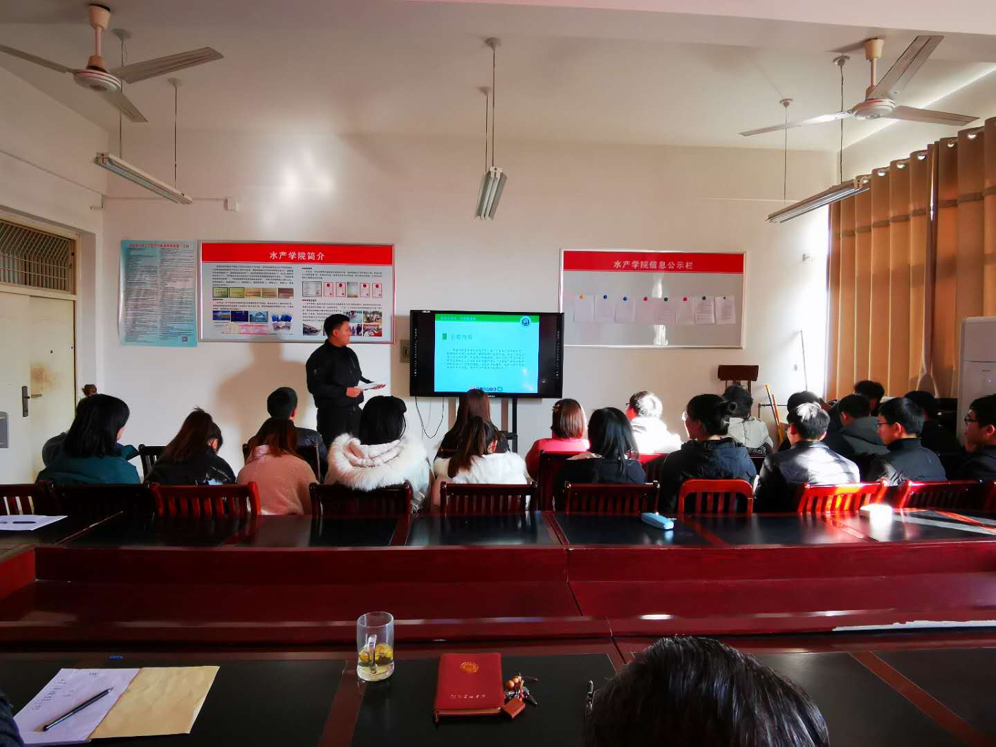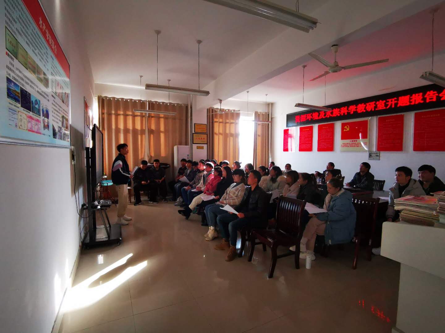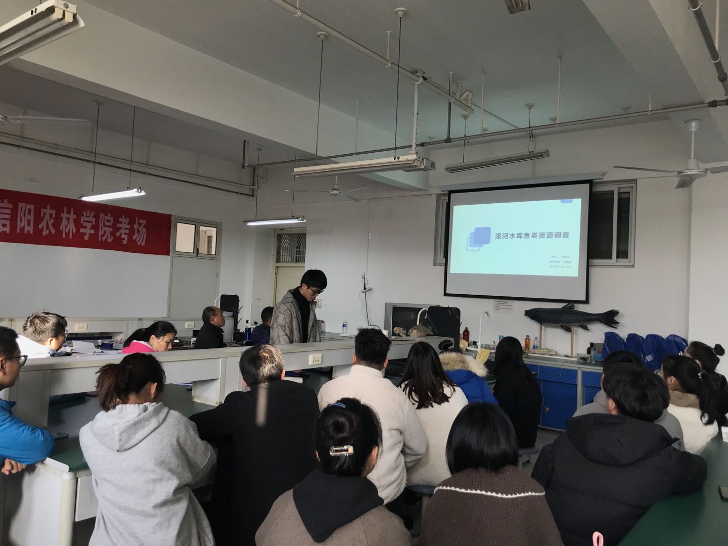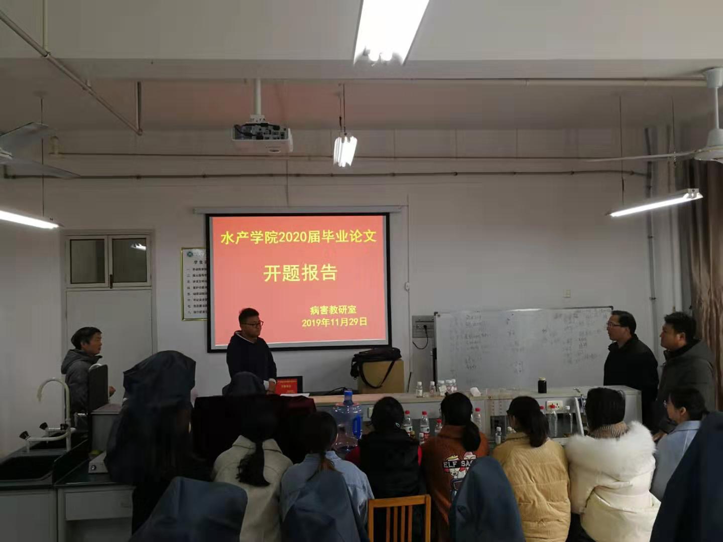 2019年11月下旬,水产学院举行2020届本科毕业论文(设计)开题报告会,2020届82名毕业生和论文(设计)指导老师参加。本次开题报告会分组分别在水产学院会议室、水生生物实验室和水产动物病害实验室进行。