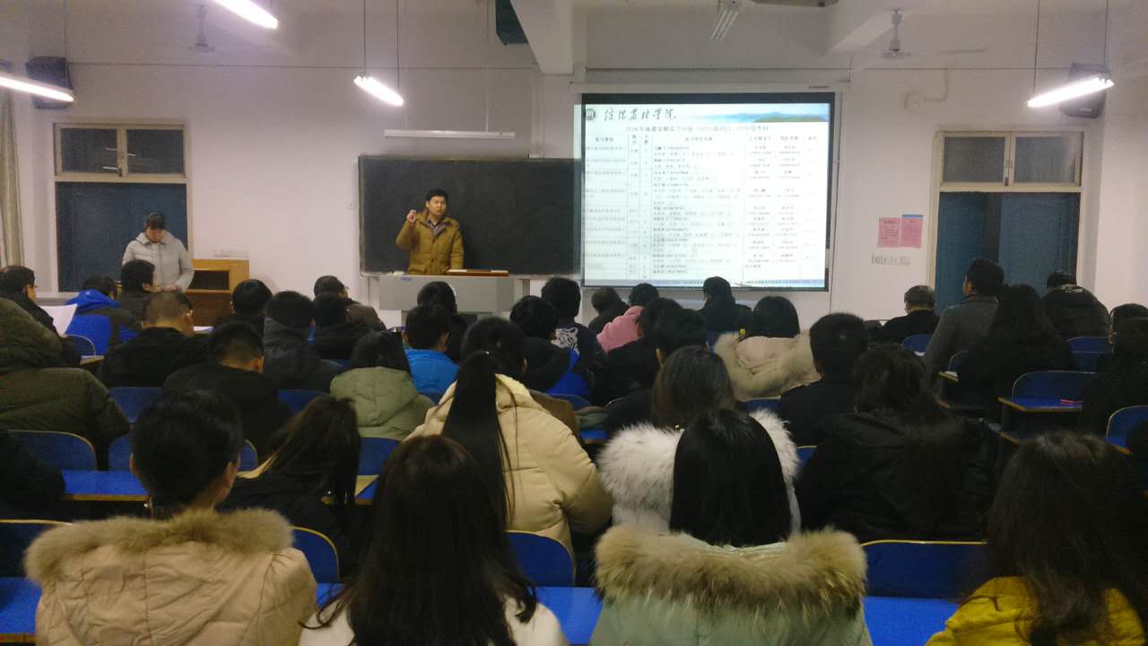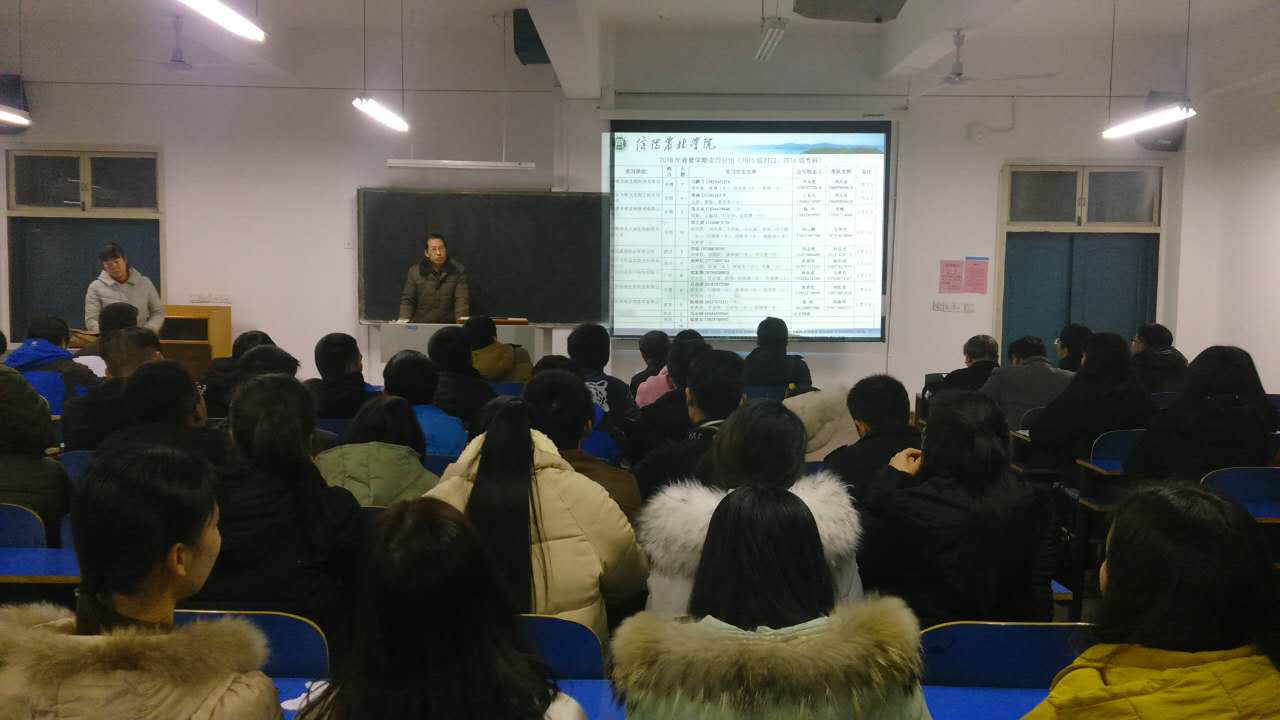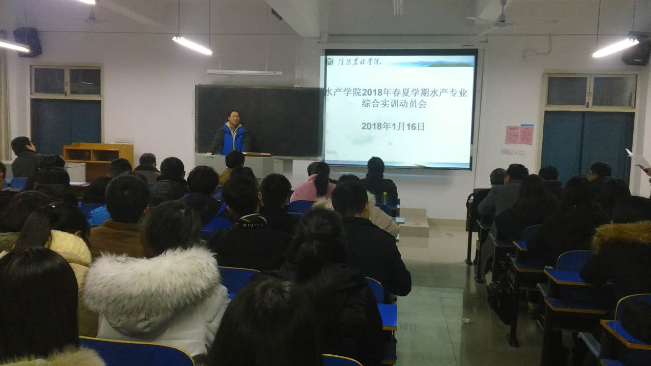 元月16日下午6点,水产学院在1教A205教室召开了2018年春夏学期水产专业综合实训动员大会。水产学院院长杨东辉、副书记郭旭升、副院长周本翔、各小组带队老师、辅导员老师及16级水产养殖技术班和15级水产养殖学(对口)本科班全体学生参加了此次大会。会议由学院组织员黄光玲主持。会上,教学秘书伦峰对本次实习安排作了详细的部署和说明,强调了此次实习的内容、期间的注意事项和纪律要求。郭书记宣读了实习分组安排情况,强调带队老师要与实习单位保持良好沟通。杨院长做了实习动员讲话,并提出了几点要求:一要端正实习态度,积极主动适应实习单位要求;二要牢记我院“厚重、诚信、坚韧、务实”的水产专业精神,扎扎实实深入企业生产中,在实践中锤炼专业技能和素质;三要有集体荣誉感,互帮互助,树立水产学子的良好形象;四要多观察,多思考,为毕业设计收集相关资料;五要注意安全,增强自我保护和防卫意识。我院历年来重视学生的实习就业工作,结合我院水产专业特色,积极探索技能型应用型本科实践教学新模式。今年院里精心挑选了9家校企合作企业作为本次实习单位。16级水产养殖技术班和15级水产养殖学(对口)本科班52名同学将分批于3月初奔赴武汉、无锡、南京等地进行为期一个学期的综合实训。(水产学院 黄光玲)