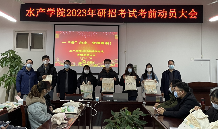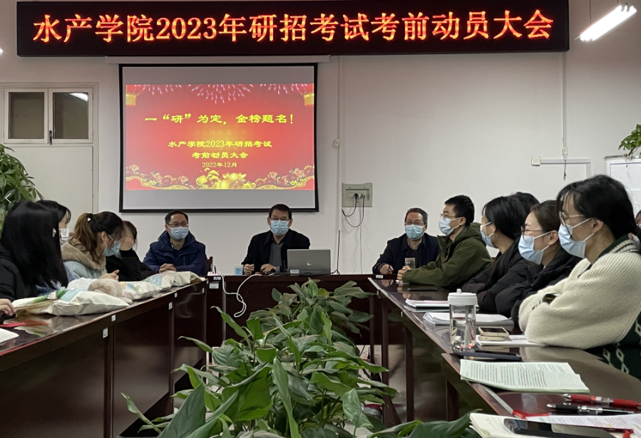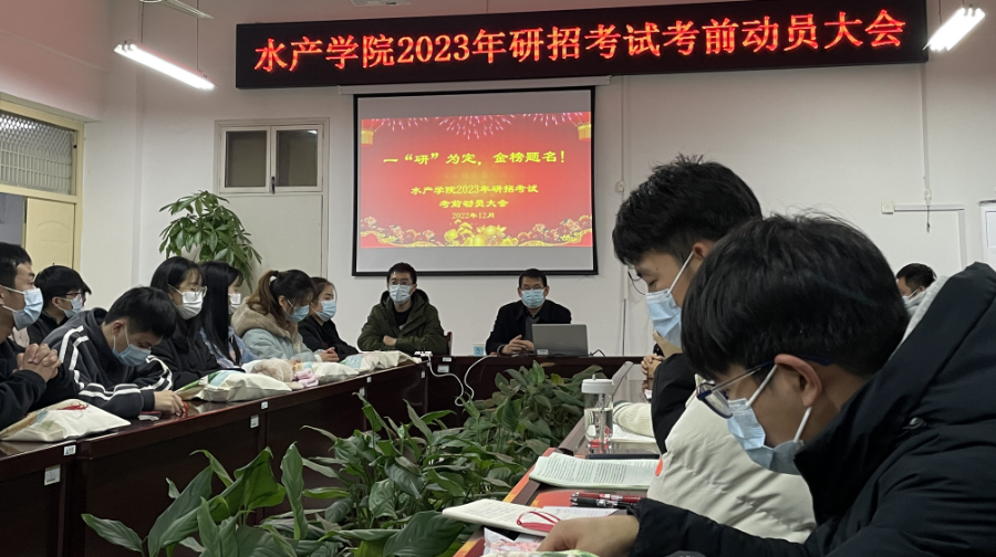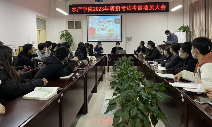 12月13日晚上7:00,水产学院在2C328会议室举办了2023年研招考试考前动员会。副校长赵聘,水产学院党总支书记、院长郭旭升,副书记黄光玲,副院长伦峰,辅导员苏超群,唐永涛、荀鹏伟等博士及99名考研学子(其中36名代表线下)参加了本次活动。动员会由伦峰主持。