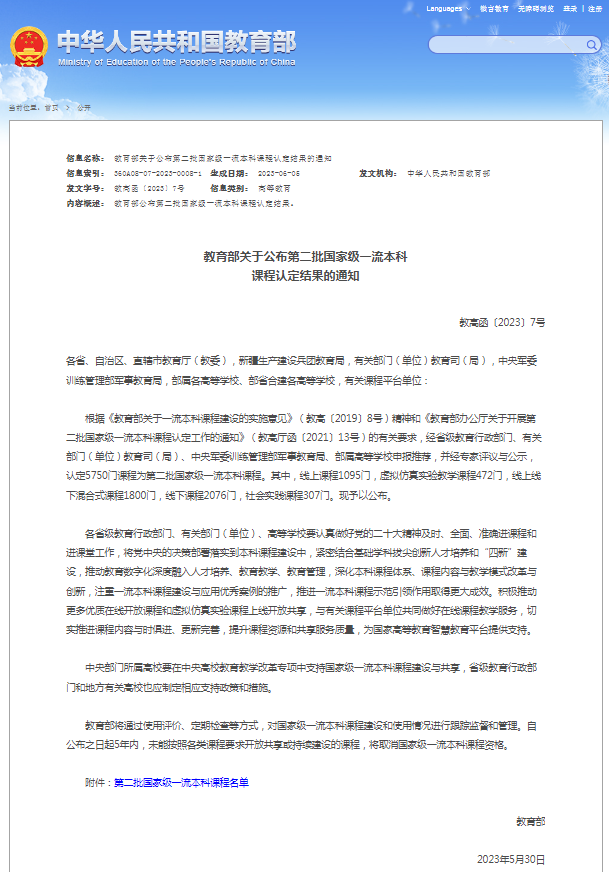 教育部一流本科课程“双万计划”是我国建设高质量本科教育的重要举措,旨在打造一批具备高阶性、创新性和挑战度的优质课程,实现课程质量全面提升。学院秉承以学生为中心的教育理念,通过强化课程思政、改革课堂教学方法、推进现代信息技术应用等方式,积极建设金课,提升了课程质量。