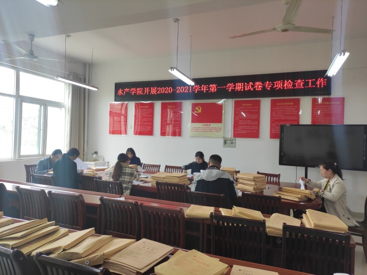 根据学校本科教学合格评估工作要求,结合学校以评促建督导检查工作,2021年4月22日上午,水产学院副院长伦峰带领教研室主任及教师代表共8名教师,开展了2020-2021学年秋冬学期试卷专项检查工作。