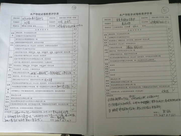 伦峰首先就“期末考核材料归档说明”、 “水产学院试卷检查评价表”、 “水产学院非试卷检查评价表”进行了详细解读,然后进行分工,要求“一卷一评价表”。检查过程中,试卷专项检查小组老师按照要求认真查看试卷档案各项材料,针对材料中出现的问题进行交流和讨论,同时建立台账。目前检查表及台账已反馈给各个任课老师,学院要求任课教师按照台账中的问题对试卷档案进行认真整改,并及时销账。(水产学院 刘俊)