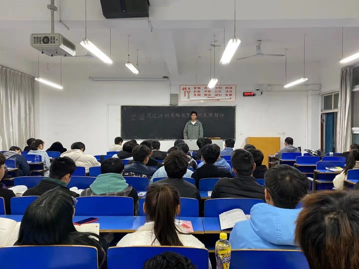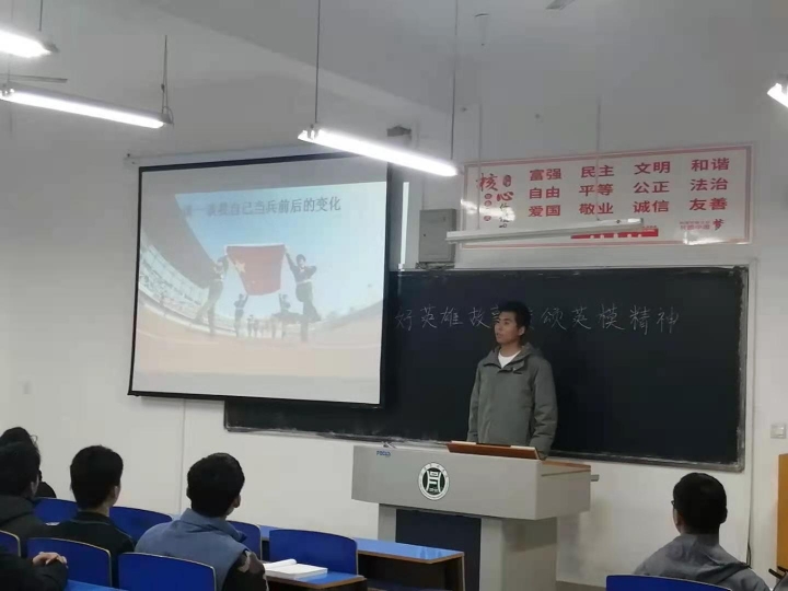 刘洪康从自己军营生活、身边故事、视频分享三个方面开展进行讲述。他首先分享了在军营的生活,从整理内务、闻哨声作息、真实的演习活动给全场的学生生动地呈现了出来。随后他带领大家学习了“卫国戍边”英雄们的事迹,观看了《我是中国人》、《卫国擎天》以及军事报道纪录片。