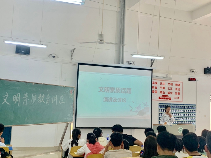 文明是当代大学生的一个基本素养,习近平总书记在党的十九大报告中指出:“青年一代有理想、有本领、有担当,国家就有前途,民族就有希望”。新时代新使命对时代新人提出了更高的标准和严格的要求。大学生是一个国家文明素质和精神追求的主要承载者,是作为社会主义事业的建设者和接班人所必备的道德修养。段老师以图片的形式展示了上课、宿舍、食堂、校园中不文明现象,并通过让学生思考大学生不文明行为产生的原因,从而意识到加强文明素质的必要性。并从五个方面明确学生们如何做一个文明的大学生和怎么争做文明大学生。最后新生代表对文明素质话题进行了精彩演讲,使同学们更加明白文明素质对大学生的重要性。