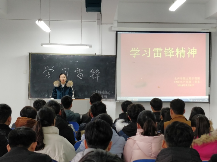 3月8日,水产学院文明示范班积极响应校团委向“雷锋同志学习”的号召,于一教A205开展 “学习雷锋精神”主题活动。水产学院团总支书记晏方舟及文明示范班全体同学参加了此次活动。
