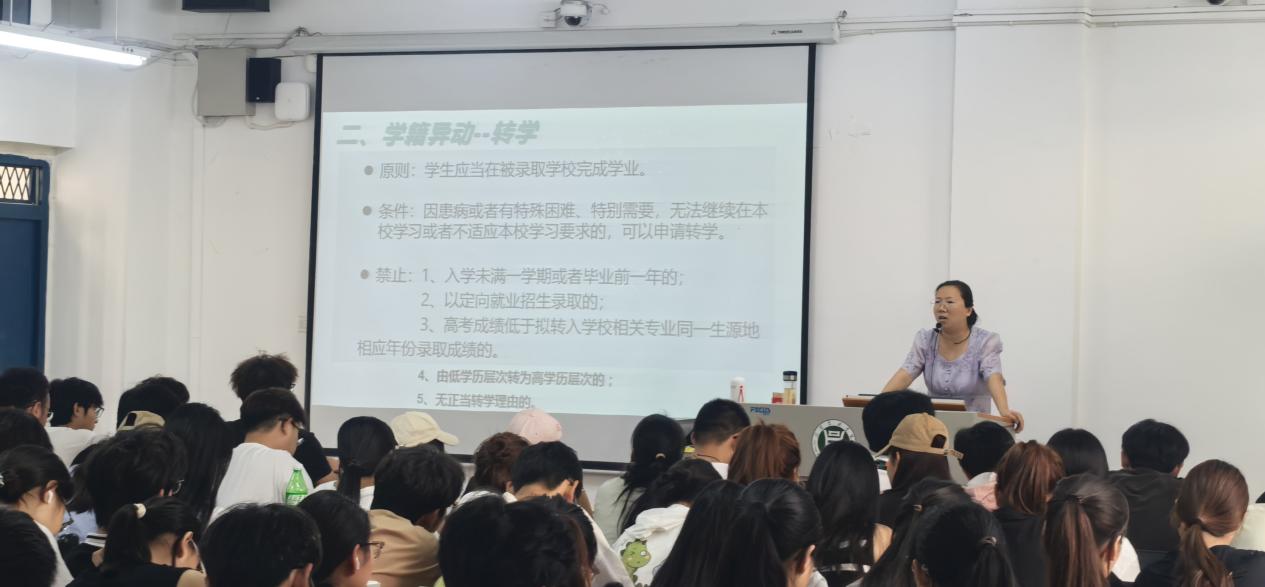 为进一步强化学院学籍管理工作规范性,全面提升学籍管理与服务品质,帮助2024级新生了解学校学籍管理制度,我院于9月26日下午在二教112开展新生入学教育之学籍管理讲座。此次讲座由我院教学秘书刘俊老师主讲,我院全体2024级新生参加讲座。