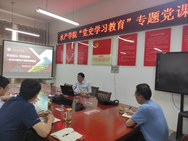6月1日下午,赵聘副校长在水产学院2C330党员活动室以“不忘初心、牢记使命——学习中国共产党百年辉煌史”为题,为全院师生党员及联系班级学生讲了一堂党史学习教育专题党课。本次活动由水产学院党总支书记郭旭升主持。
