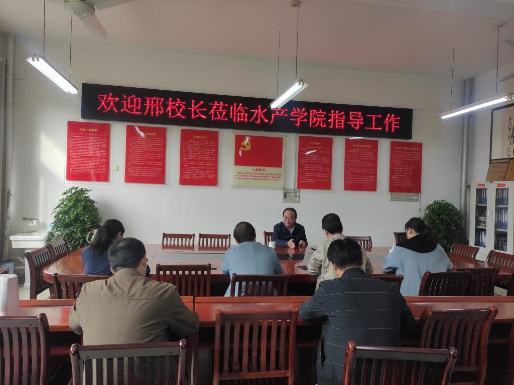10月13上午,校长邢勇莅临水产学院调研指导工作。会议由水产学院党总支书记、院长郭旭升主持。水产学院科级以上干部及部分核心课程骨干教师参会。