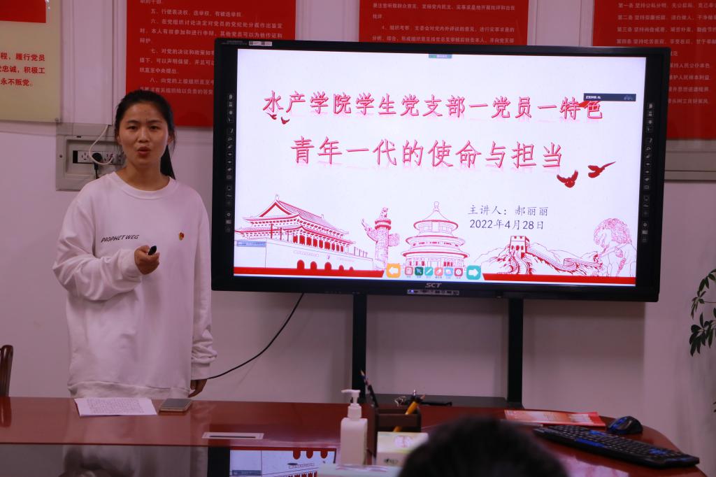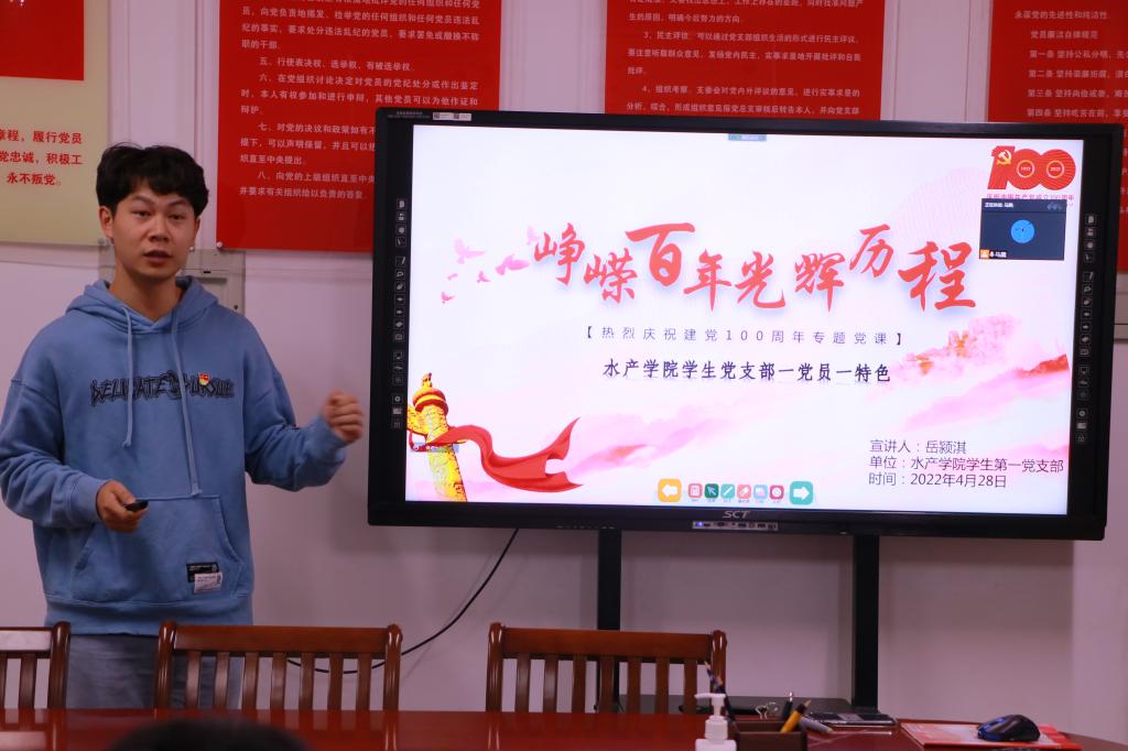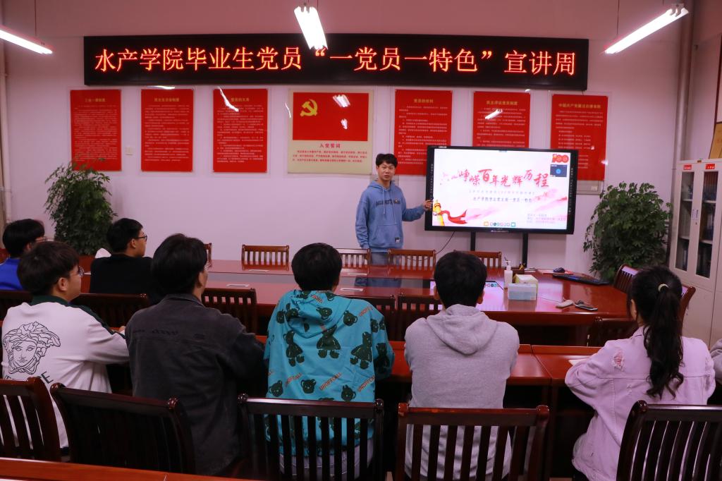 近日,水产学院学生第一党支部、第二党支部策划开展“一党员一特色”宣讲周活动。本次宣讲周包括“政治理论宣讲”、“考研经验交流”、“就业经验分享”、“学生干部培训”、“大学生活规划”五个主题,旨在激发基层党支部活力,充分发挥党支部战斗堡垒作用和党员先锋模范作用,不断加强学生党支部“‘三二一模式'充分发挥大学生党员先锋模范作用”党建品牌建设。