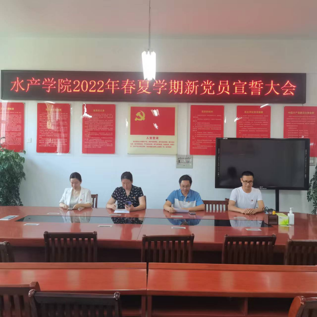 6月14日下午,2022年春夏学期水产学院新党员入党宣誓大会以线上线下相结合的模式在2C330党员活动室和腾讯会议APP隆重举行,党总支副书记黄光玲、副院长伦峰及学生党支部全体师生党员、部分积极分子参会。会议由水产学院党总支副书记黄光玲主持。