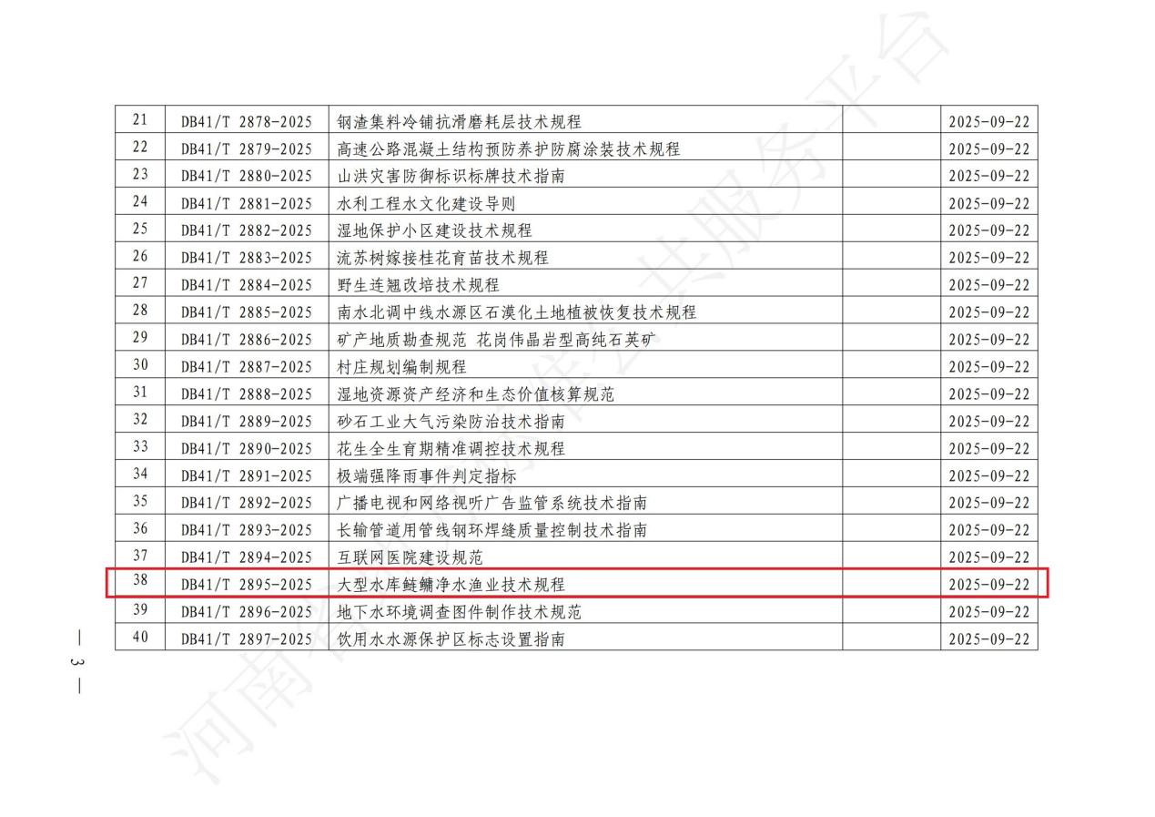 近日,由beat365在线平台官网主持编制的河南省地方标准《大型水库鲢鳙净水渔业技术规程》(DB41/T 2895-2025)由河南省市场监督管理局批准发布,并将于2025年9月22日起实施。本标准由beat365在线平台官网、信阳市南湾水库渔业开发有限公司、泼河水库管理局等单位共同起草、制定,是河南省水库渔业全产业链标准化体系建设的重要组成部分,也是beat365在线平台官网河南省水库生态渔业产业技术创新战略联盟的工作成果。