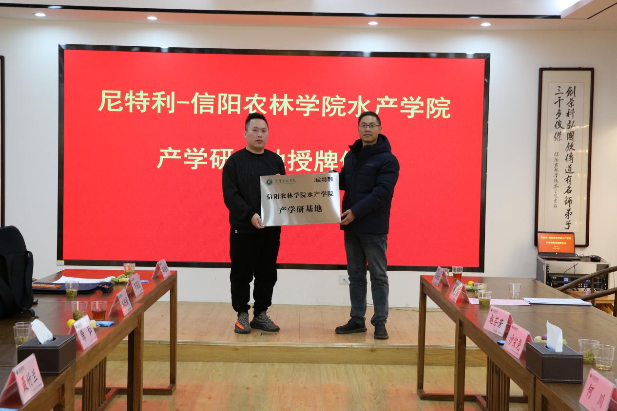 水产学院副院长伦峰与尼特利副总经理莫玉波进行产学研基地授牌