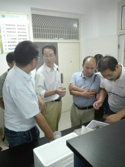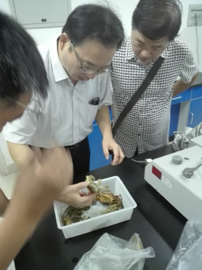 2017年9月19日下午,潢川黄国粮业有限公司水产养殖基地送患病河蟹来水产学院鱼病实验室,希望水产学院为养殖场诊断河蟹病害。水产学院教授级高工郭旭升、高级实验师周本翔、汪成竹副教授、田海军副教授、伦峰老师、黄荣静老师等鱼病专家团队详细调研了池塘河蟹养殖情况,初步诊断为河蟹“水瘪子”病,与养殖场技术顾问针对河蟹病害发生与防治情况进行了详细交流。在交流过程中,水产学院鱼病专家分别对养殖户的养殖模式、苗种来源、水质管理、水草种植、药物使用等均仔细分析,对比各个池塘的差异、与往年的差异等,综合分析原因,并提出部分解决方案,以控制病害的发展。