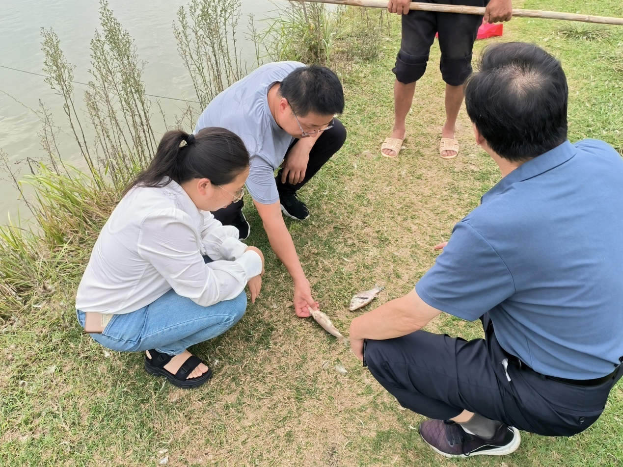 4日上午,科技特派员服务队来到商城县丰源种养殖专业合作社。由于近期高温干旱少雨,导致池塘水体混浊、水质较差,池塘内蓝藻、甲藻大量爆发,水面漂浮死鱼,未能及时捞出,同时该合作社在池塘里又养了近1000只麻鸭,加剧了养殖水体的污染。养殖户反映近期使用了改底调水试剂,但效果不明显,近期死鱼较多。针对近期出现的各种问题,科技特派员们建言献策,提出加大新鲜水体的注入,增加增氧机的工作时长,根据天气调整投饵时间及数量,及时捞出死鱼进行深埋处理,并用生石灰对水体进行消毒作业,在中秋节临近的销售旺季,尽快将成熟麻鸭上市售卖,提高经济效益的同时减轻水体污染。
