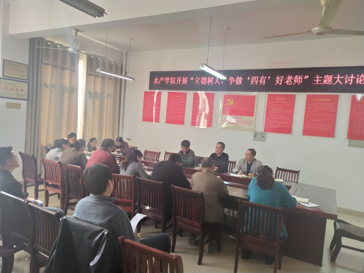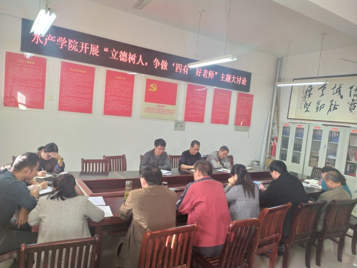 根据《beat365在线平台官网开展“不忘初心、牢记使命”主题教育实施方案》(信农党〔2019〕100号)的要求,水产学院11月12日下午在实验楼2C330开展“立德树人,争做‘四有’好老师”大讨论,会议由水产学院党总支书记郭旭升主持,学院全体教职工参加了会议。