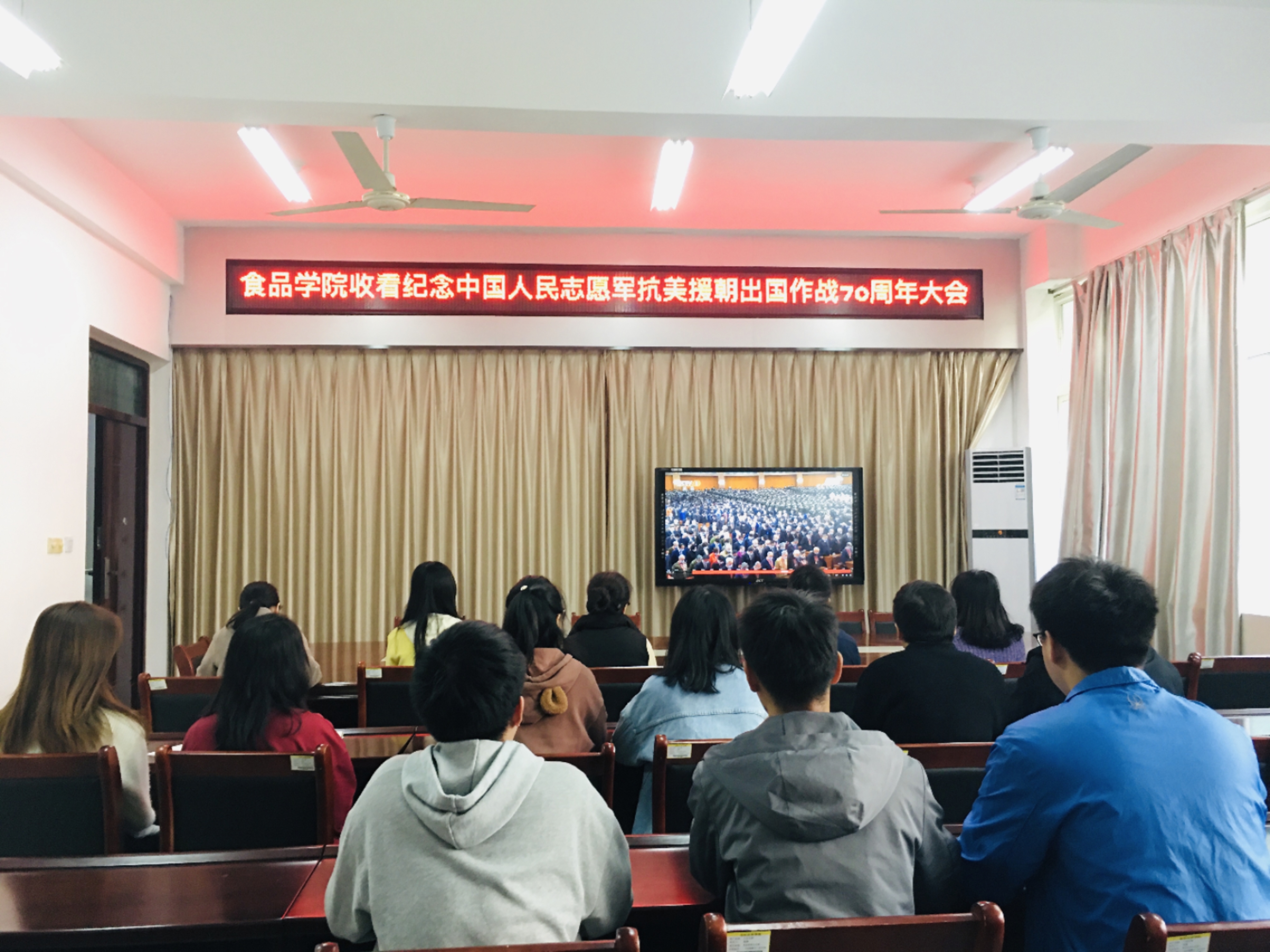 10月23日上午,纪念中国人民志愿军抗美援朝出国作战70周年大会在北京人民大会堂隆重举行,食品学院集中组织教职工和学生代表一同观看大会直播。