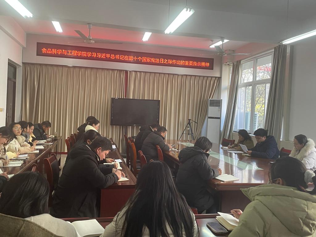 12月12日,食品科学与工程学院在科技楼1B206会议室传达学习习近平总书记在第十个国家宪法日之际作出的重要指示精神。学习会由学院党总支副书记刘涛主持,全院教职工参加。