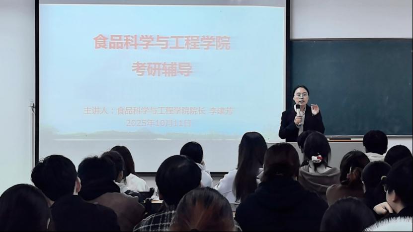为帮助2026届毕业生精准把握考研政策,科学规划备考路径,10月11日中午,食品科学与工程学院在二教109举办考研辅导讲座。本次讲座由学院院长李建芳主讲。