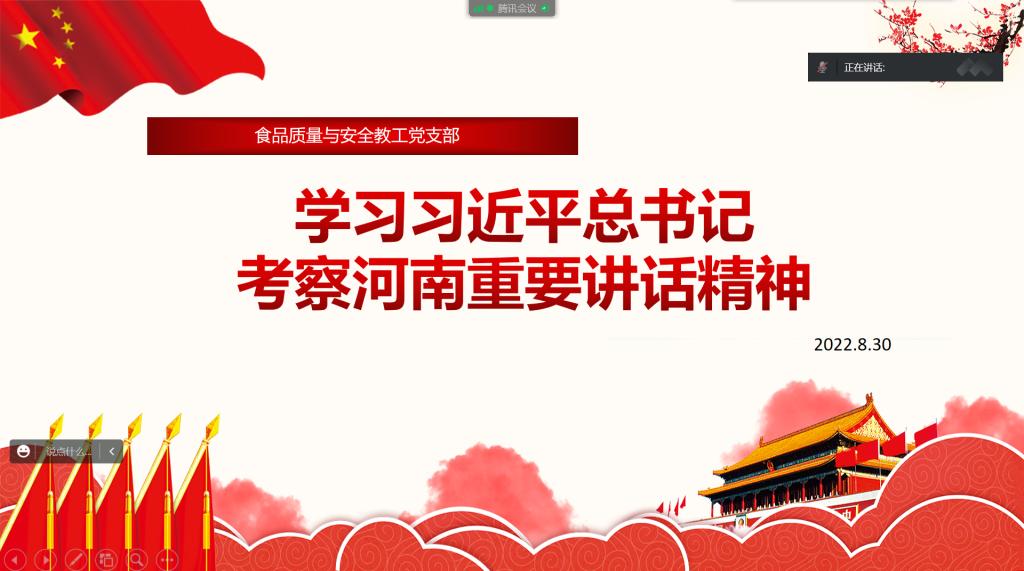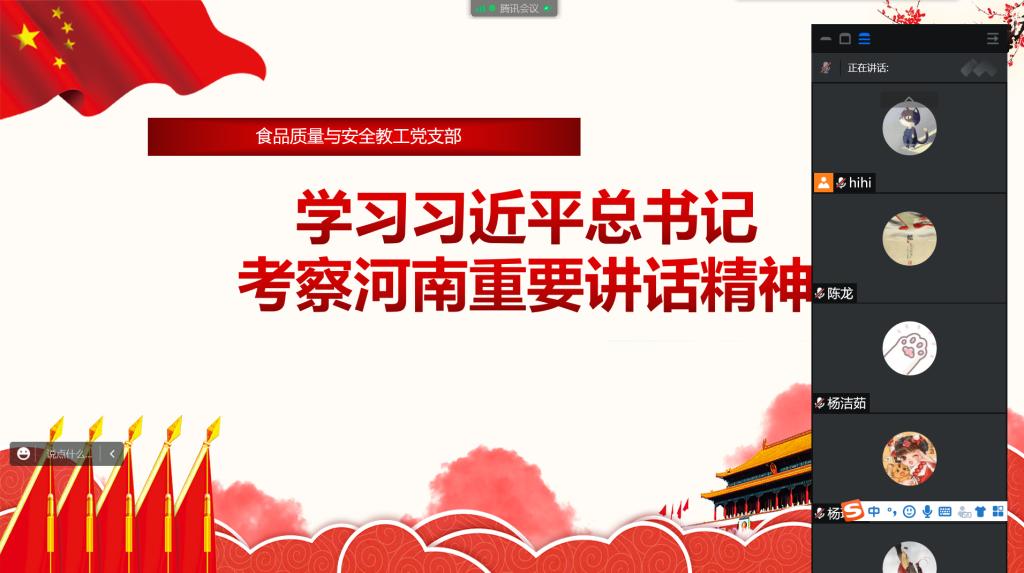 为认真学习贯彻习近平总书记考察河南重要讲话精神,学习贯彻落实省委省政府《关于贯彻落实习近平总书记视察河南重要讲话精神支持河南大别山革命老区加快振兴发展的若干意见》及信阳市《贯彻落实〈中共河南省委 河南省人民政府关于贯彻落实习近平总书记视察河南重要讲话精神支持河南大别山革命老区加快振兴发展的若干意见〉三年行动方案》各项精神,食品质量与安全教工党支部于8月30日下午组织全体党员召开线上会议。