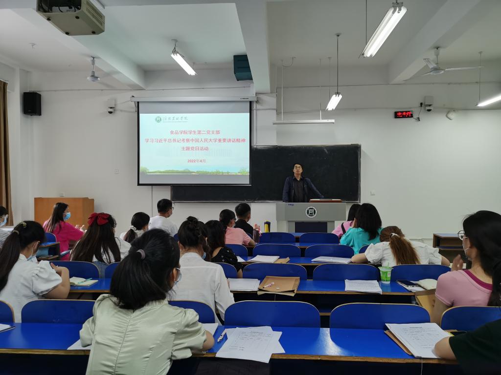 4月28日中午,食品学院学生第二党支部在一教A101组织开展学习习近平总书记在中国人民大学考察时的重要讲话精神主题党日活动。会议由党支部书记柳诚刚主持。