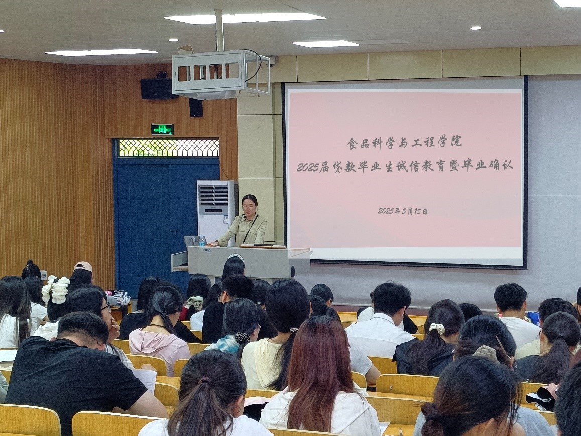 为增强贷款毕业生诚信意识,引导学生树立正确的信用观念,切实做好学生助学贷款贷后管理工作,5月15日,食品科学与工程学院在二教308开展2025届贷款毕业生诚信教育暨毕业确认会议。会议由专职辅导员杨婷主持,2025届生源地和校园地贷款毕业生参加。