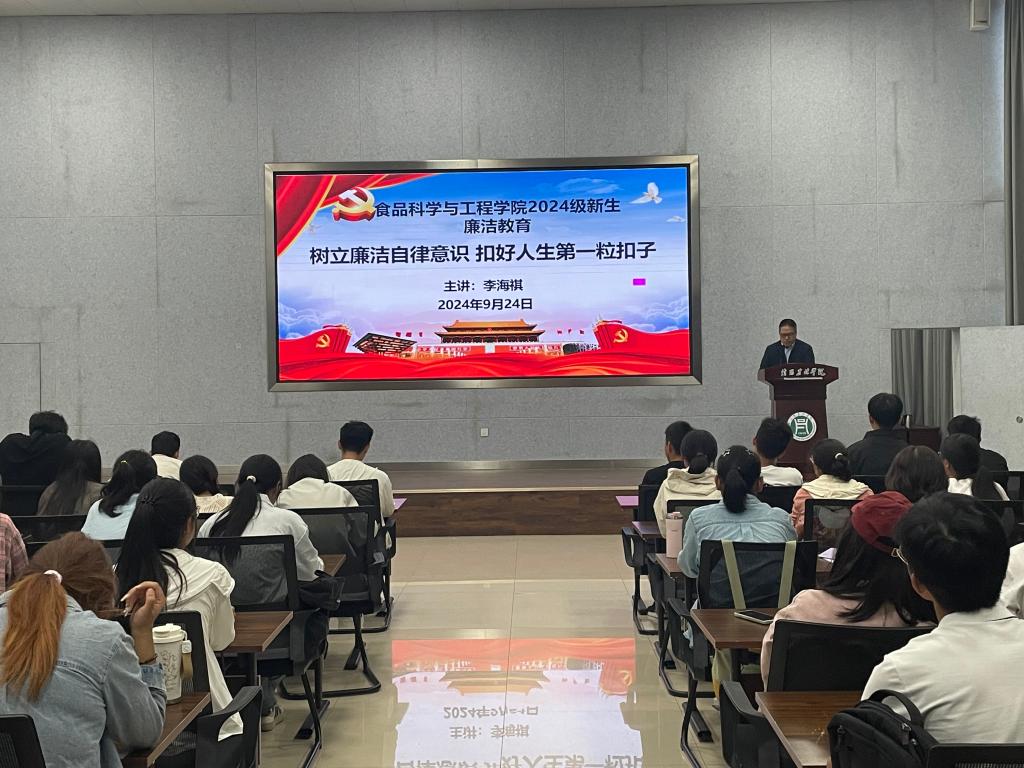为了培养2024级新生廉洁自律意识,树立正确的世界观、价值观、人生观,引导新生扣好大学生活第一粒扣子。2024年9月24日上午,食品科学与工程学院党总支书记李海祺在大学生就业创业中心教室开展了2024级新生入学教育,为大一学生上廉政教育课。