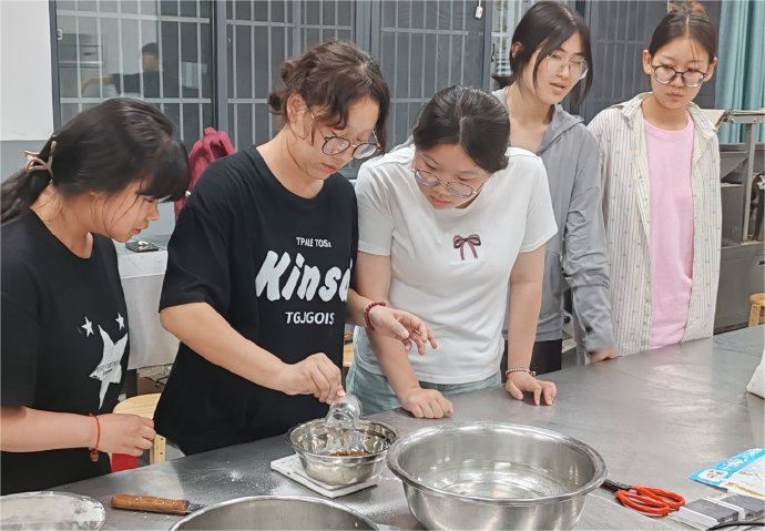 教学结束后,参与者们被分成小组,利用提前准备好的材料开始亲手制作。经过面糊的精心发酵和烘焙,散发着浓郁香甜气息的红糖发糕迅速问世,获得了现场同学们的一致好评。