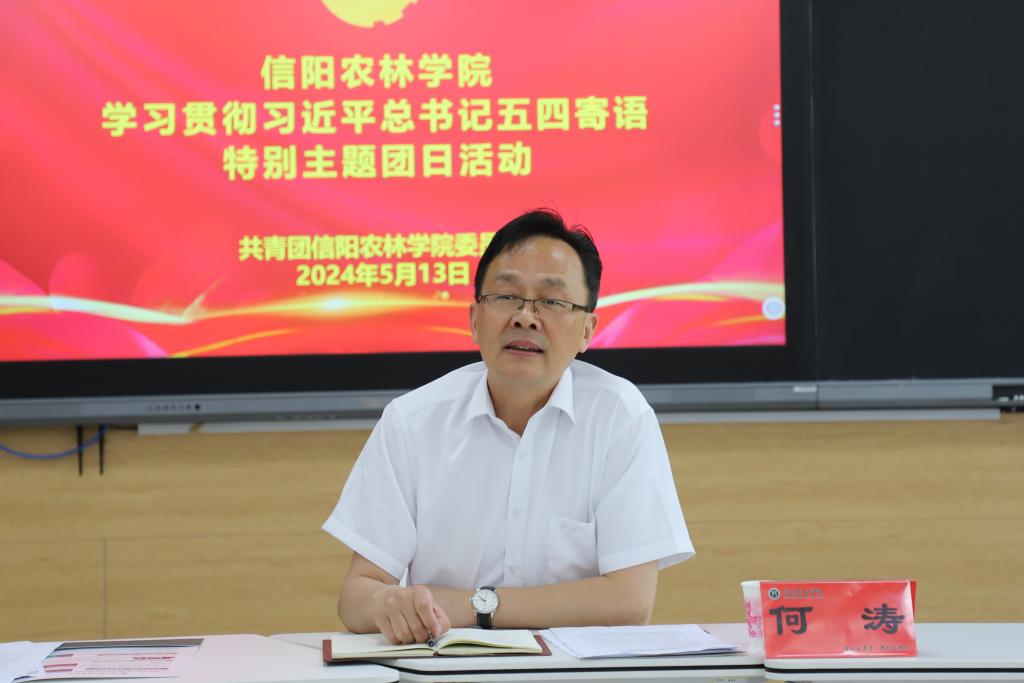 何涛与同学们亲切交流,共同庆祝青年人的节日。他赞扬了支部同学们积极昂扬的精神面貌,为同学们阐释了五四精神的核心要义,生动讲述了学校发展中的故事,并对全体团员青年提出四点希望:一是要树立远大理想。要发扬五四精神,高擎理想的火炬,从内心深处厚植对党的信赖、对中国特色社会主义的信心、对马克思主义的信仰,将个人理想与国家命运紧密结合在一起,在奉献社会、服务人民中实现青春梦想。二是要担当时代重任。要积极投身学校学雷锋、乡村振兴等一系列活动中,在融入活动、融入校园、融入社会中不断锤炼个人素质,提升个人能力,为将来在更广阔天地中施展自身才华打下坚实基础。三是要练就过硬本领。要通过不断的学习和实践练就过硬的核心本领,不断在时代变化中提升应对各种困难挑战的素质和能力,积极运用所学本领投身于中国特色社会主义的伟大实践,以过硬本领贡献国家、服务人民。四是要勇于砥砺奋斗。要切实担负起时代赋予的责任和使命,把家国情怀落实到具体行动中,在担当中作为,在磨砺中成长,走稳人生第一步,扣好人生第一粒扣子,在信阳这片热土上书写属于信阳林学院的崭新时代篇章。活动尾声,何涛为支部团员代表赠送《习近平与大学生朋友们》(第二卷)。