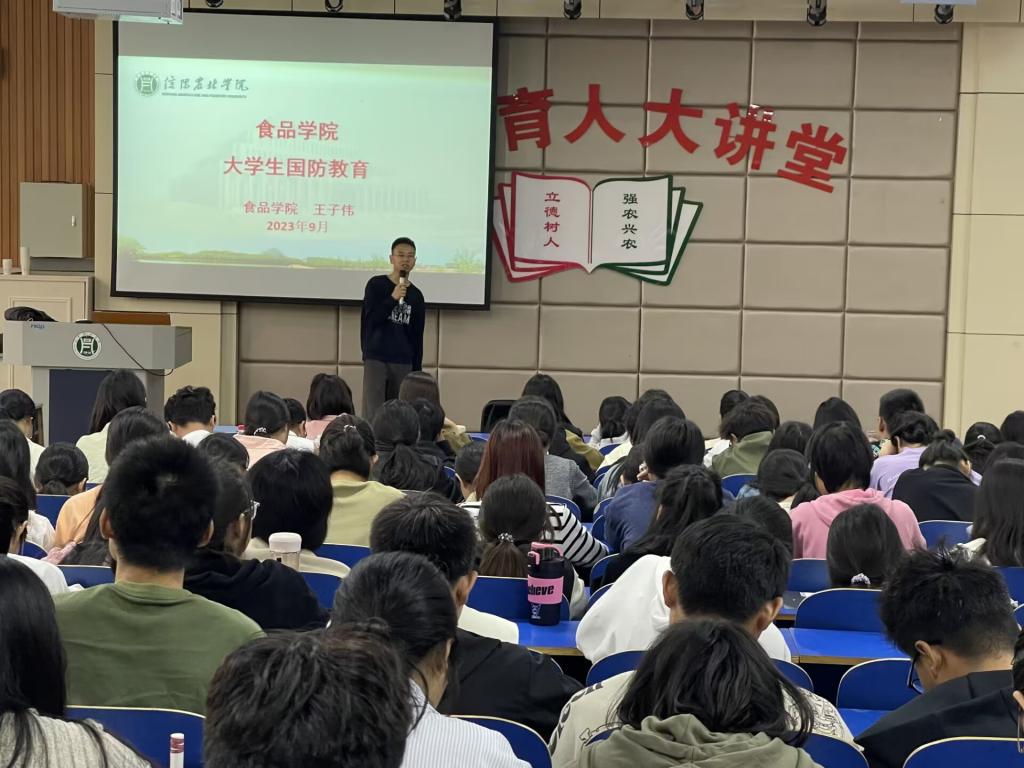 为了让2023级学生了解当前的国际形势,了解国防的发展动向,增强学生的国防观念和国家安全意识,厚植其爱党爱国爱社会主义的情感,9月28日上午,食品学院在一教E101教室为2023级新生做大学生国防教育暨征兵宣传报告会,学院武装专干王子伟老师主讲。