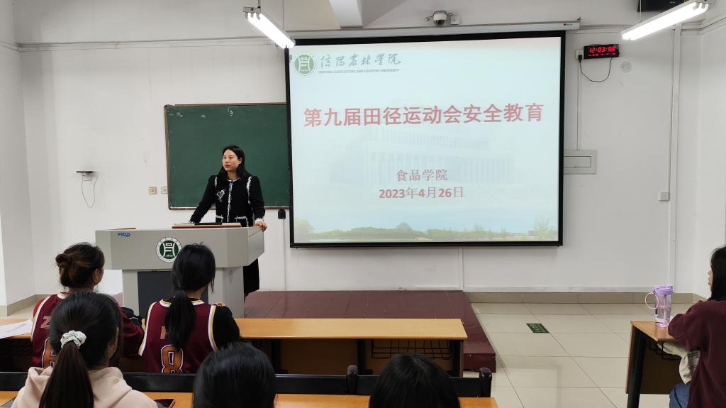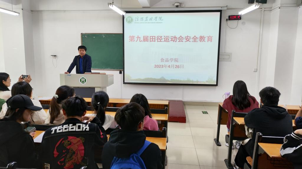 为全方位做好校运会赛前准备工作,增强运动员们的信心、鼓舞士气,强化赛风赛纪和赛事安全意识,2023年4月26日中午,食品学院在二教107召开第九届田径运动会赛前动员会,食品学院党总支副书记刘涛,团总支书记易蕾,辅导员黄卉卉、柳诚刚,全体运动员及学生会主要学生干部参加了本次动员大会。