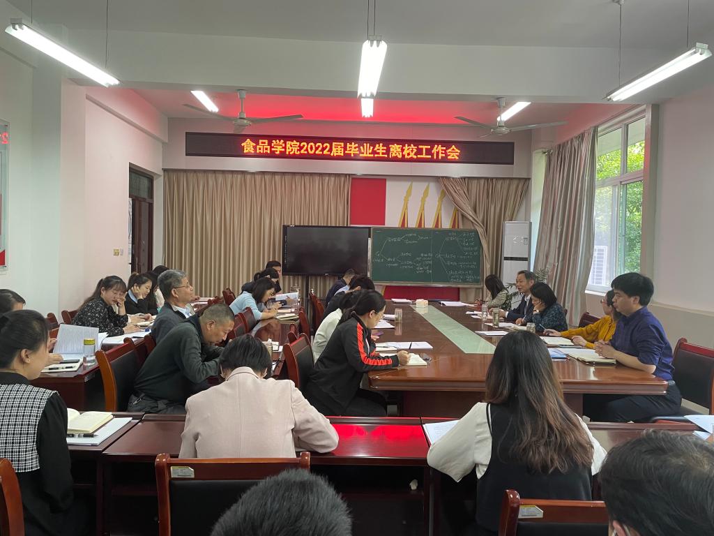 为保障学生顺利毕业,切实做好我院2022届毕业生离校工作,营造安全、祥和的校园毕业氛围,2022年5月24日下午,食品学院举行2022届毕业生离校工作会,食品学院党总支书记夏新奎、院长邢淑婕、党总支副书记刘涛、副院长李建芳、副院长邵颖、全体教职工参加此次会议。