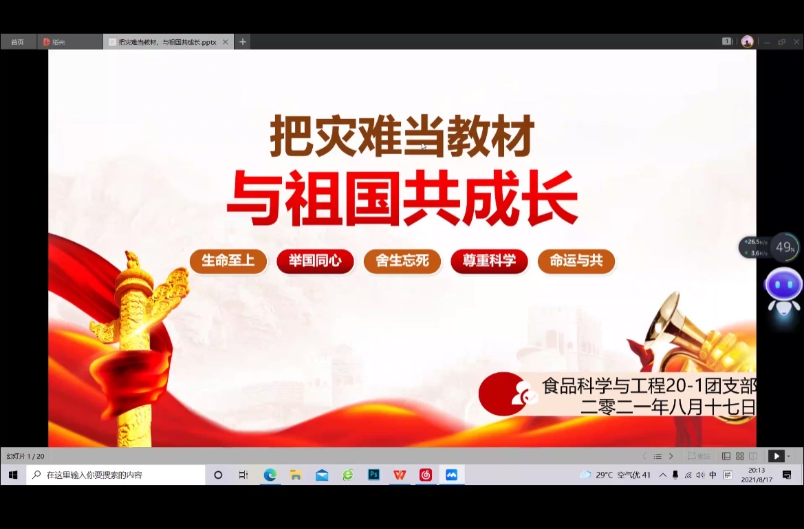 2021年7月,对河南来说是不平凡的一月。“汛”情还未散去,“疫”情却突然反弹。天灾无情,人却有情。举国上下用团结筑起了抗洪抗疫的钢铁长城,无数个平凡的英雄谱写了感天动地的生命赞歌。为了让同学们更好地学习灾难下的时代精神,引领大学生做时代新人,beat365在线平台官网食品学院于2021年8月举办了“把灾难当教材,与祖国共成长”线上主题团日活动。