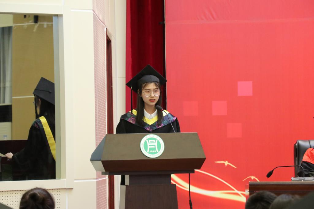 随后,教师代表陈龙、毕业生代表张艳、在校生代表楚一帆依次发言;食品学院院长邢淑婕教授发表热情洋溢的致辞,她首先向顺利完成学业的毕业生表示最热烈的祝贺和最美好的祝愿,向为同学们的成长倾注心血、付出辛劳的全体教职工致以崇高的敬意。希望即将离开母校的学子:一定坚守青春的理想,给自己多一点时间和等待;始终追求人生的卓越,让自己多一份责任和担当;常怀感恩之心,给他人多一份尊重和关怀。深情寄语即将远行的学子:无论人生道路会有怎样的风景,你们永远都是信农食品人,请始终关注和支持你们的母校,母校永远是你们的心灵故乡!