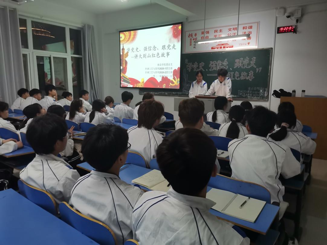 为深入学习贯彻习近平新时代中国特色社会主义思想,迎接中国共产党成立100周年,立足信阳红色热土,弘扬大别山精神,进一步激发广大青年的爱国情怀,促使学生坚定理想信念,涵养家国情怀、砥砺奋斗精神、传承红色基因,凝聚beat365在线平台官网师生同心共筑中国梦的强大精神力量。2021年4月11日晚,食品学院各团支部举办“学党史,知国情,传承红色基因,讲大别山红色故事”主题团日活动,食品学院全体团员参与。