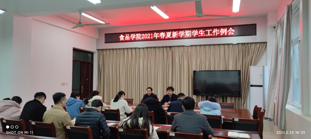 2月25日下午,食品学院学工组在科技楼1B206召开2021春夏新学期学生工作例会,学院党总支书夏新奎、学院党总支副书记刘涛、学院全体专兼职辅导员参会,会议由刘涛副书记主持。