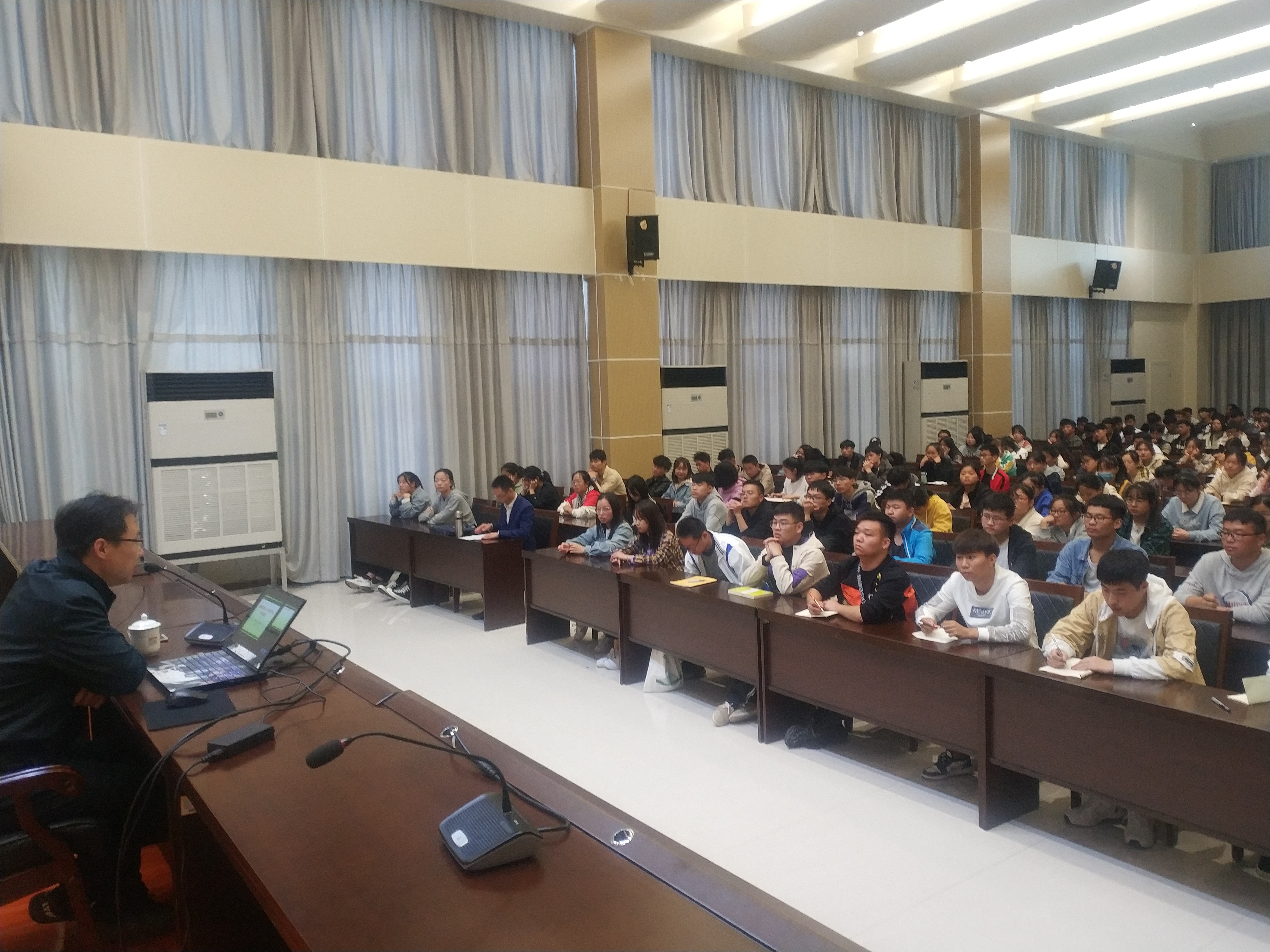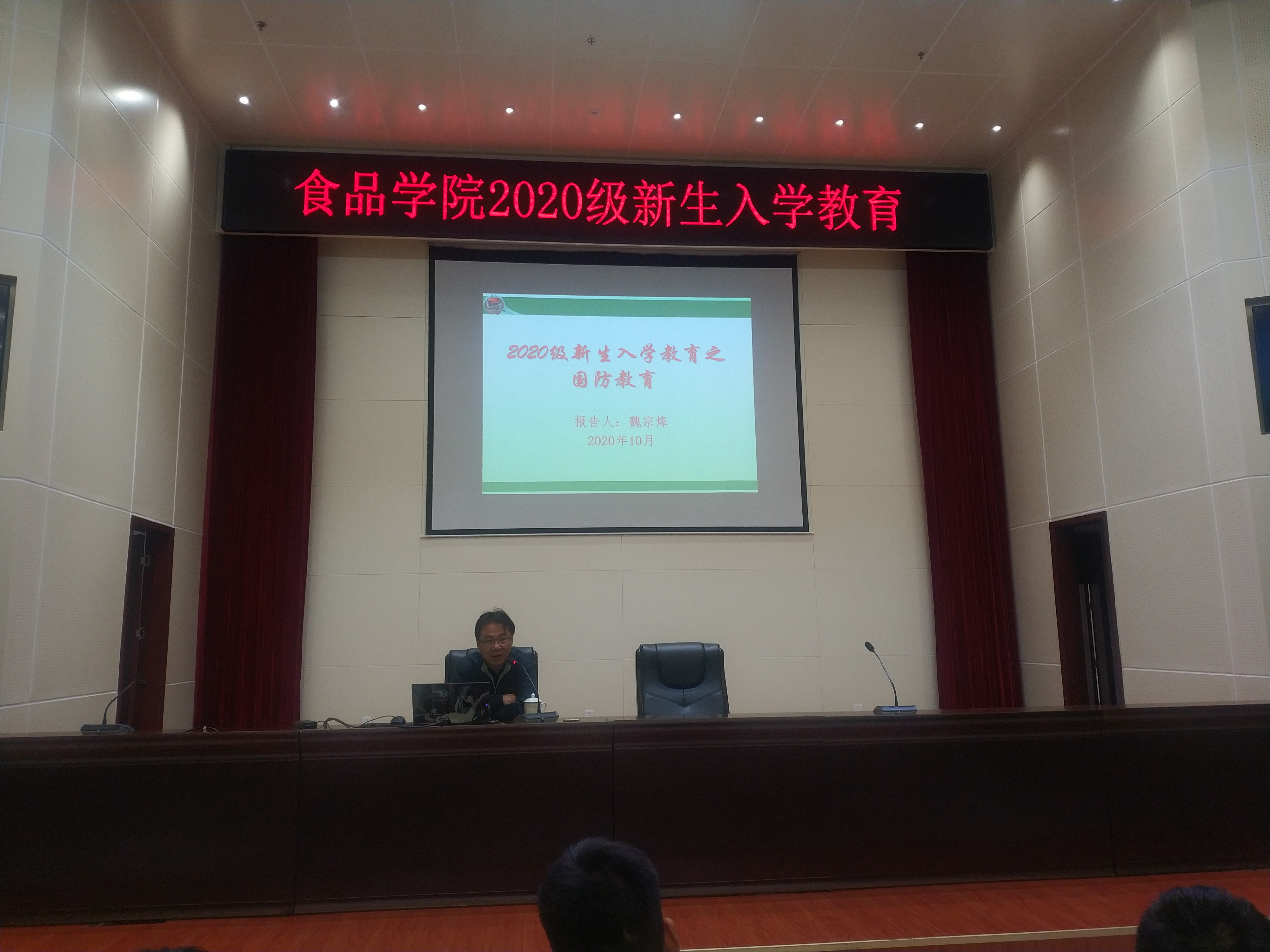 为更好的让学生了解当前的国际形势,了解国家的发展动向,理解爱国主义精神,10月22日晚,食品学院在图书馆六楼报告厅召开了“国防教育”主题报告会,会议特邀校武装部魏宗烽老师主讲,食品学院2020级全体新生参加。