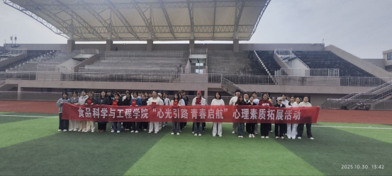 为丰富同学们的校园文化生活,缓解学生学习压力,释放紧张情绪,10月30日,食品科学与工程学院在操场举办以“心光引路,青春启航”为主题的心理素质拓展活动。活动由黄卉卉、丁湘懿老师指导,食品科学与工程学院25级心理委员、心理健康部成员及部分24级学生参与。