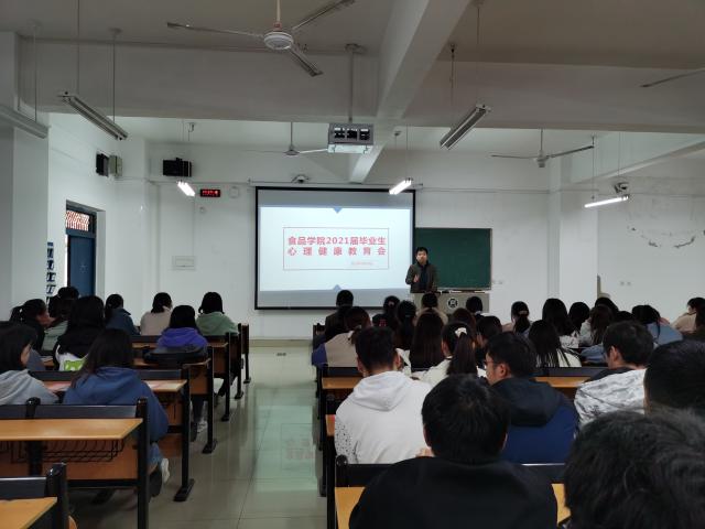 3月25日下午,食品学院在二教103召开2021届毕业生心理健康辅导会。院党总支副书记刘涛,毕业班辅导员陈龙、黄卉卉老师参加会议。