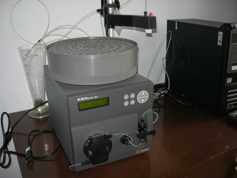 技术指标和参数:手动控制,电脑数据采集和处理AKTAprime 流速 0.1-50 ml/min 压力 0-2 MPa(292psi) 8通道程控缓冲液切换阀UV 检测 254,280 nm 电导检测 1 μS/cm - 999.9 mS/cm 压力监控电动混合程控进样阀收集器- 95管 18 mm 试管自动收集。