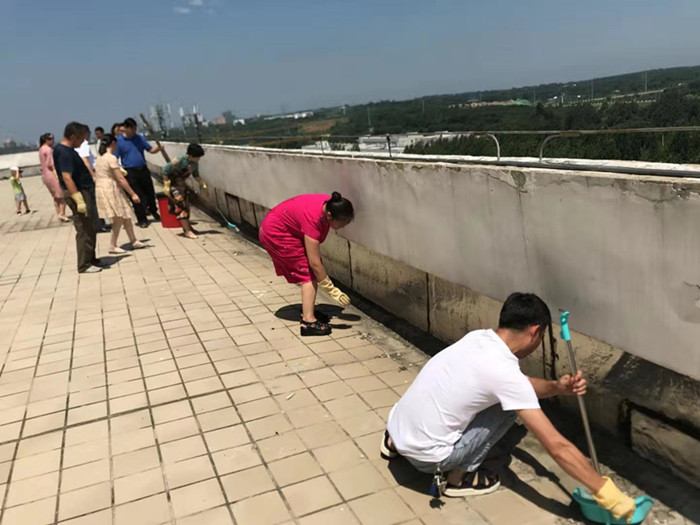 会后,馆领导带领各位部主任从负一楼巡查到五楼,逐一排查书库、阅览室、过刊室、自习室、开水间的安全隐患,并带领部分教职工来到六楼顶层,一同疏通清理雨水排水口堵塞物及丢弃的各种垃圾,以避免汛期暴雨造成水患。(图书馆)