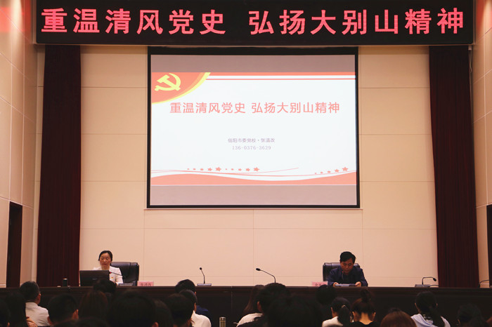 5月18日下午,图书馆联合校纪委、学生处在图书馆六楼报告厅举办了“重温清风党史 弘扬大别山精神”党史专题讲座。本次讲座由信阳市委党校中华文化教研室主任张清改副教授为大家主讲,学生处副处长魏宗峰,校纪委第二纪检监察室副主任何军,图书馆馆长李明彦及全校师生代表200余人参加。讲座由图书馆党总支书记余承忠主持。
