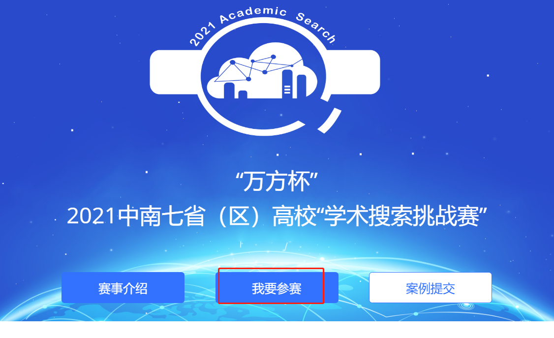 1.进入“万方杯”2021中南七省(区)高校“学术搜索挑战赛”官网:http://searchcontest.hbdlib.cn/#/home/list,点击“我要参赛”。
