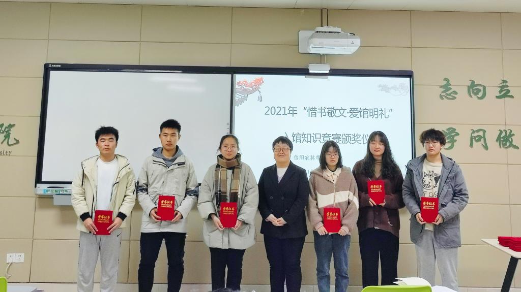 11月23日下午,beat365在线平台官网图书馆在四楼智慧教室举办了2021级新生入馆知识竞赛颁奖仪式,图书馆教师代表和部分获奖学生出席了本次活动。