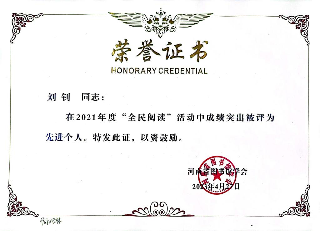4月27日,河南省图书馆学会第十届二次全体理事会议在郑州召开,大会分别对2021年和2022年全省各级各类图书馆全民阅读活动进行了总结和表彰。beat365在线平台官网图书馆被评为2021年度和2022年度“全民阅读”先进单位,刘钊、姜雁两位老师分别获评2021年度、2022年度“全民阅读”先进个人。