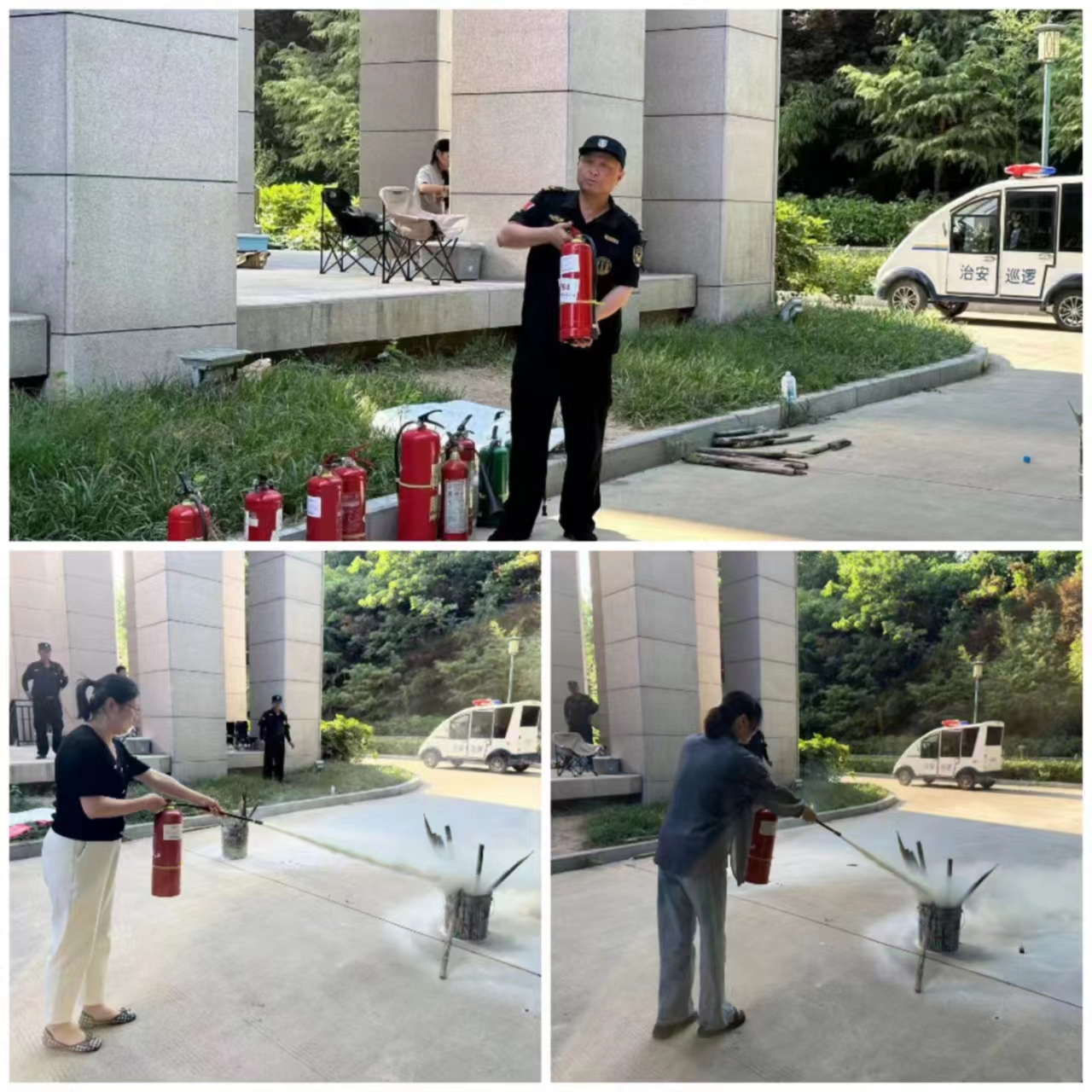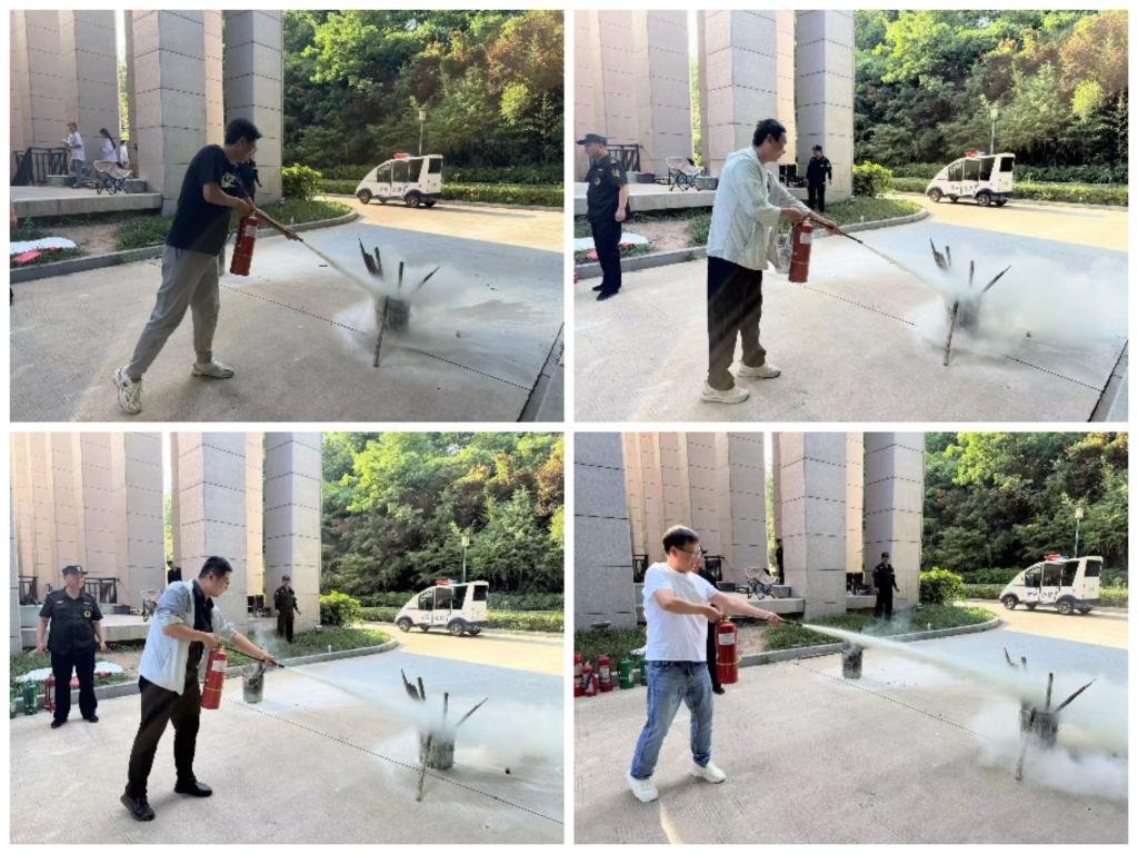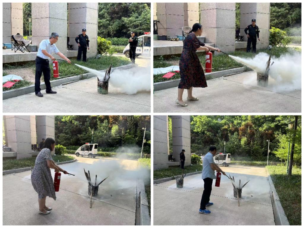 本次培训以消防灭火器使用实操演示为重点,保卫处人员详细讲解各类灭火器、灭火毯使用方法及使用现场类型,通过模拟现场,演示应急处置方案。并在此过程中,向在场教师讲授了火情紧急处理常识、自救及消防安全知识。现场教师实地操练,掌握了灭火器 “一拔二握三瞄四扫”的使用方法,成效明显。
