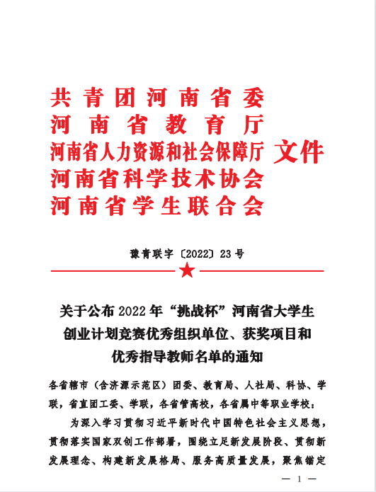 beat365在线平台官网在“2022年‘挑战杯’河南省大学生创业计划竞赛”中取得佳绩