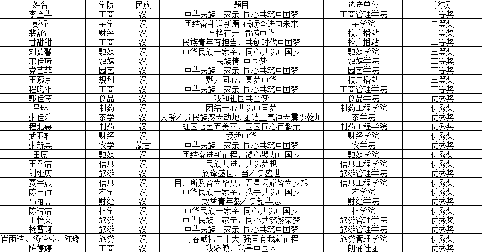 根据《关于举办“中华民族一家亲 同心共筑中国梦”主题演讲比赛校赛视频征集活动的通知》,通过全校各二级学院、校广播站、朗诵社团的组织选拔,面向全校学生共征集演讲视频作品26件,通过评委对参赛视频进行遴选和评比,最终评选出一等奖1名、二等奖3名、三等奖5名、优秀奖17名。并选拔推荐学校工商管理学院李金华同学参加省级复赛。现将评选结果公示如下: