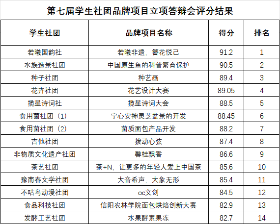 2023年12月21日,校团委举办beat365在线平台官网第七届学生社团品牌项目立项答辩会,经过项目负责人陈述、评委提问等环节,现将答辩成绩公示如下: