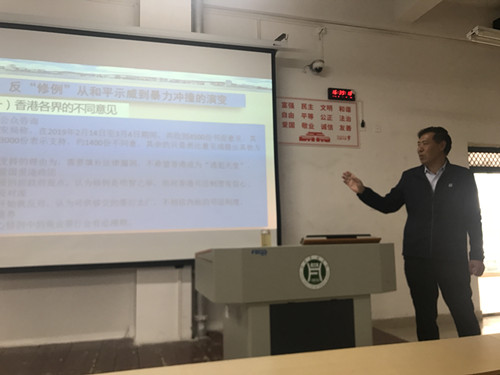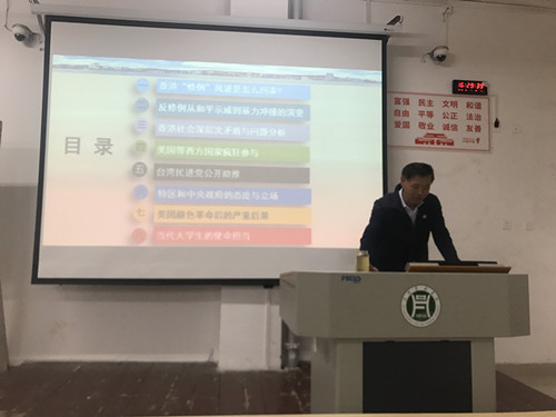 11月4日,体育学院院长李俊在二教306教室为2019级城乡规划(专升本)等专业学生上了一堂题为《香港局势的源起、问题、实质》的形势与政策课。
