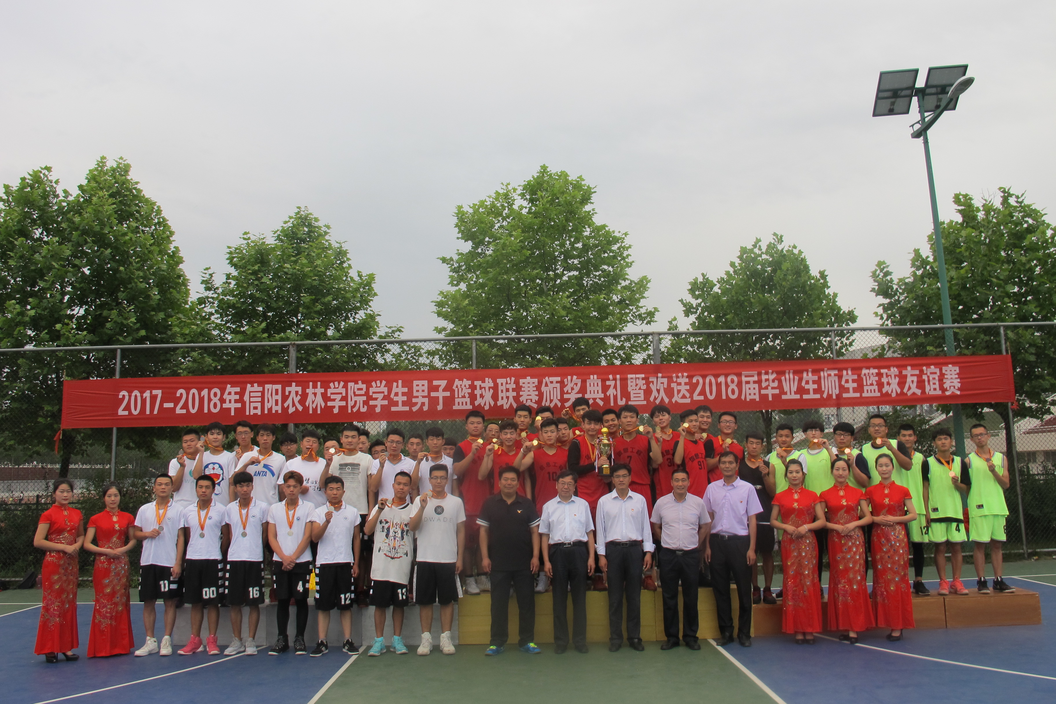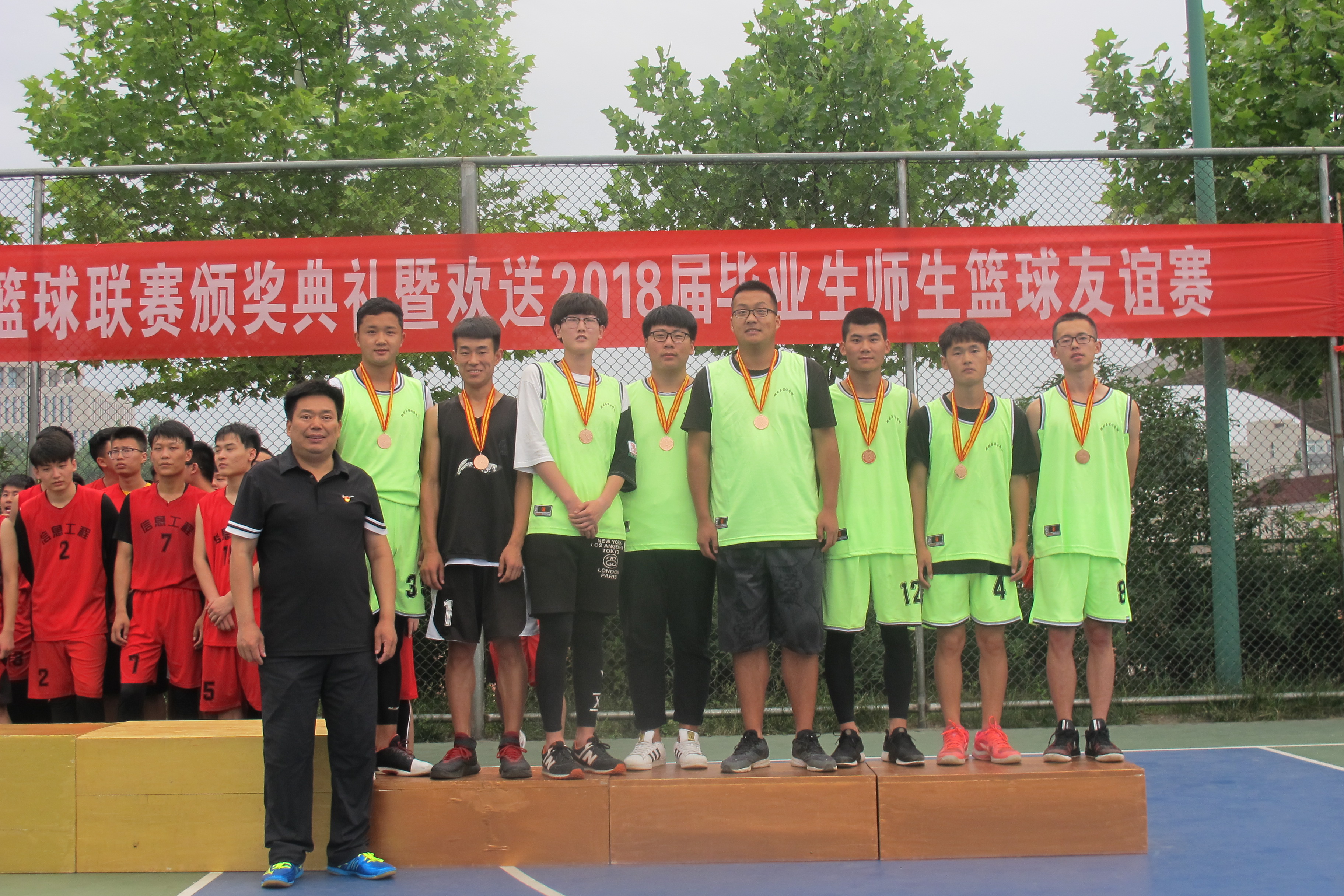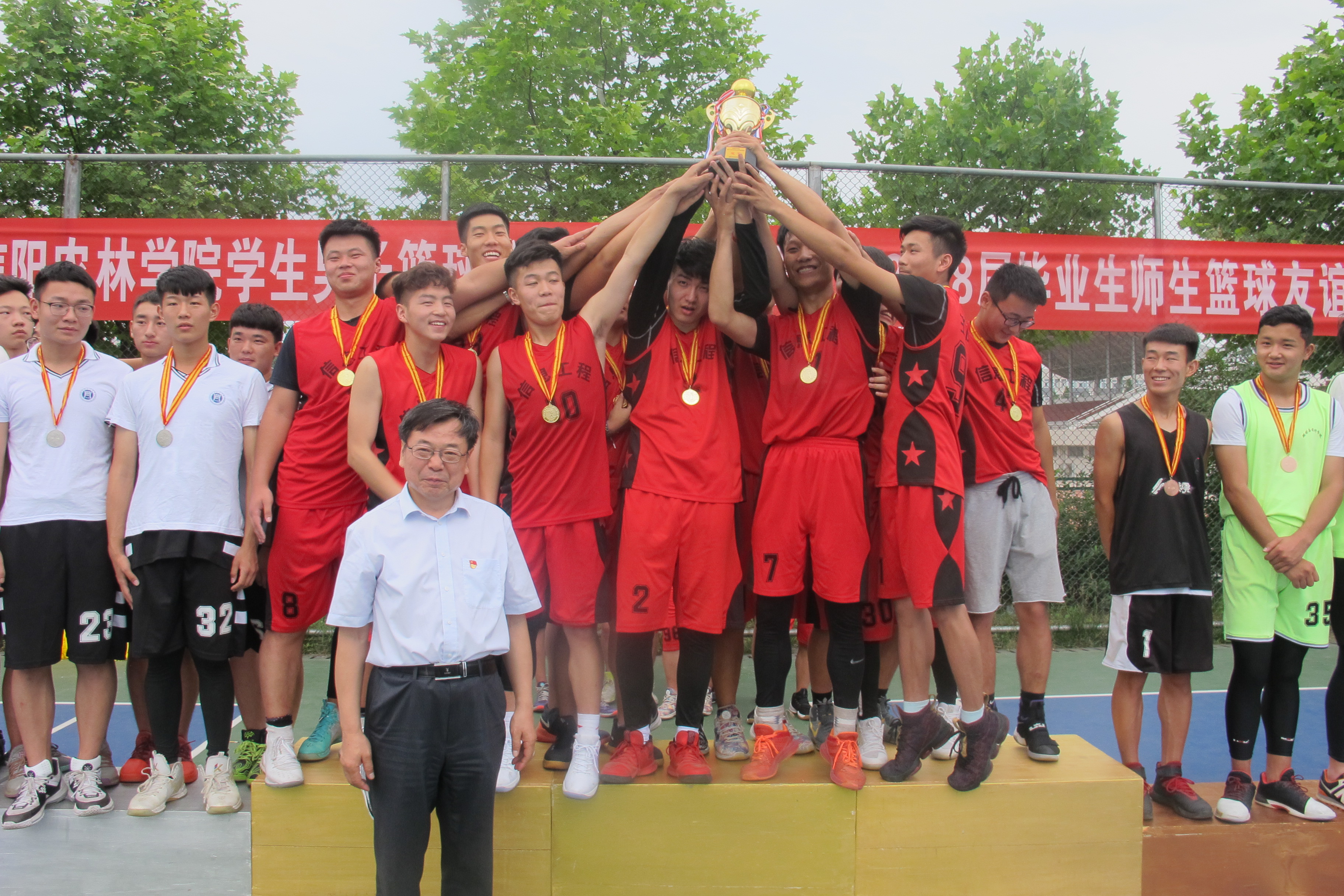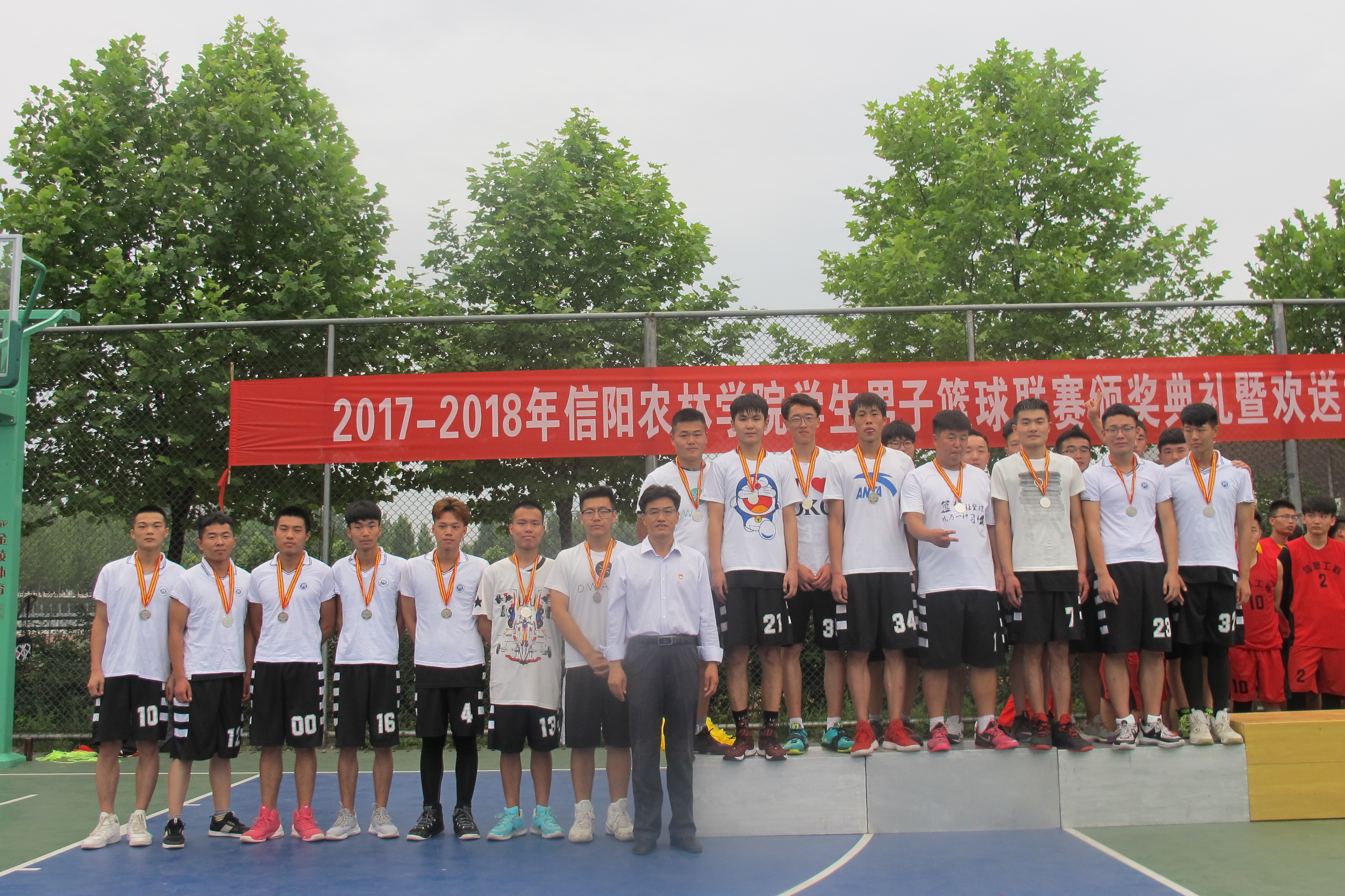 本届篮球联赛,信息工程学院代表队获得篮球联赛的冠军;农学院、规划与设计学院、代表队分别获得亚军和季军;工商管理学院、水产学院、牧医工程学院、园艺学院、林学院代表队分获四-八名。